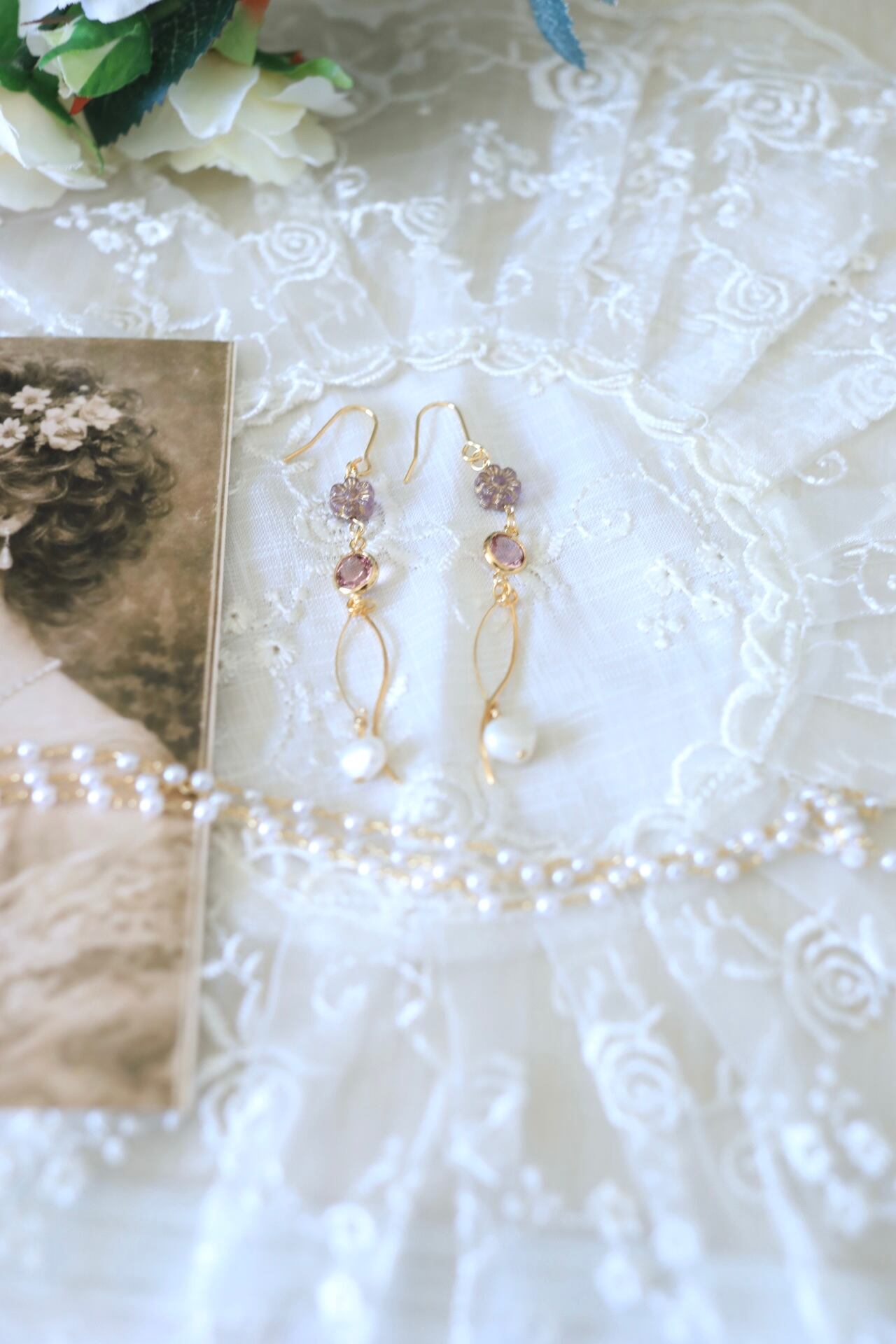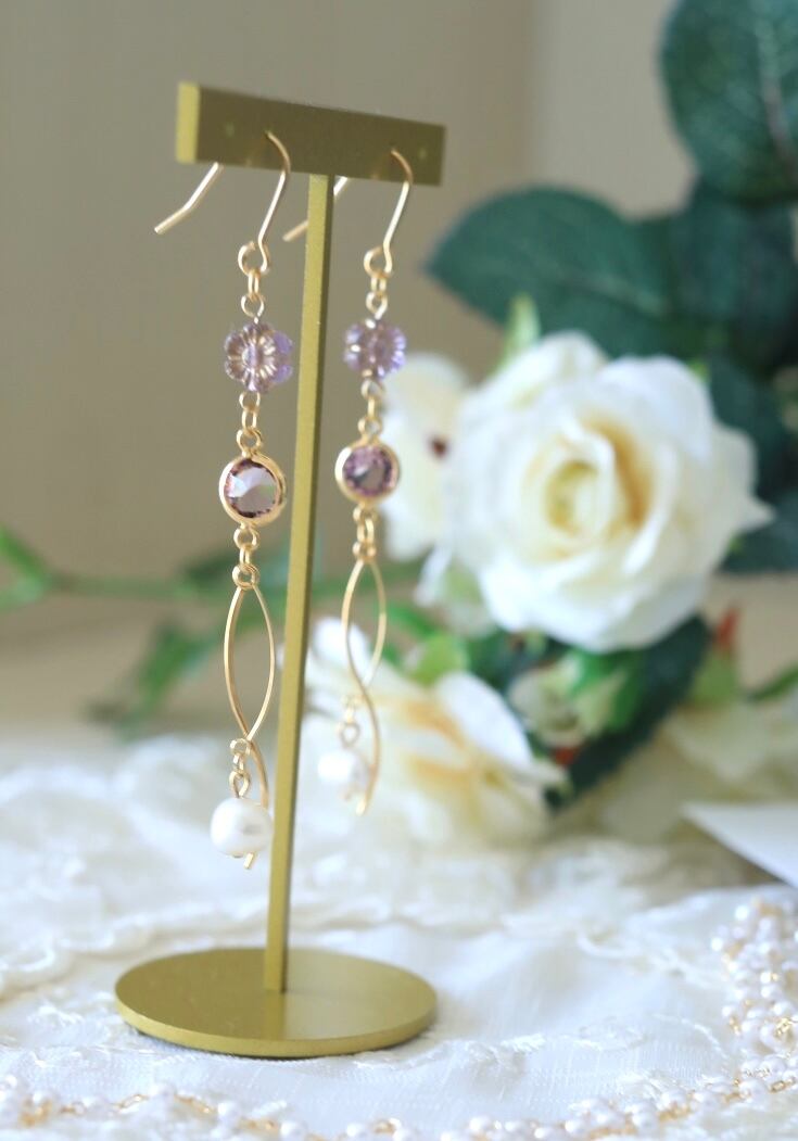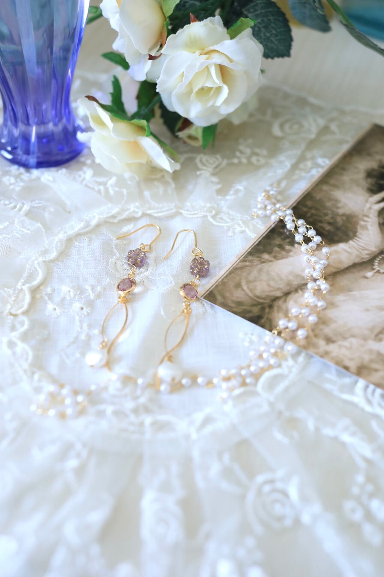 紫の小さな花のチェコビーズと上品なストーン、 淡水パールが揺れ、顔まわりを華やかに見せてくれます。